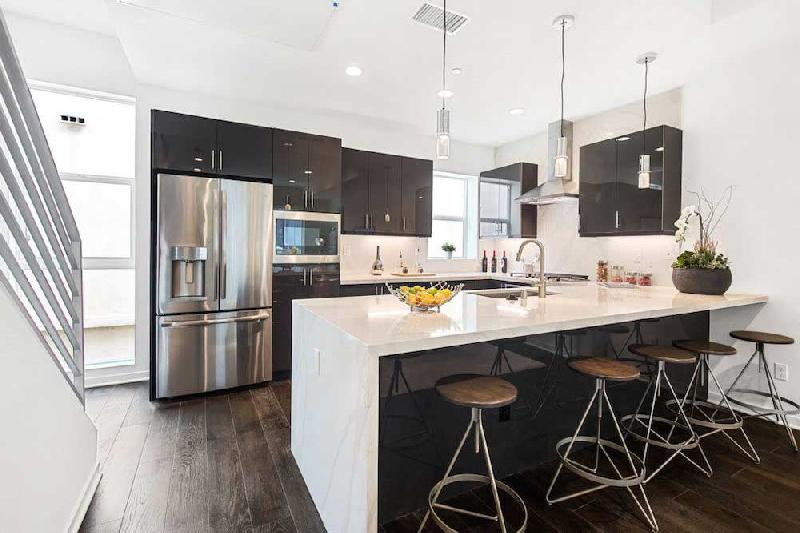 - Quartz slab breakfast bar, countertops and backsplash with stainless steel single compartment undermount sink with Moen® brushed nickel pullout faucet