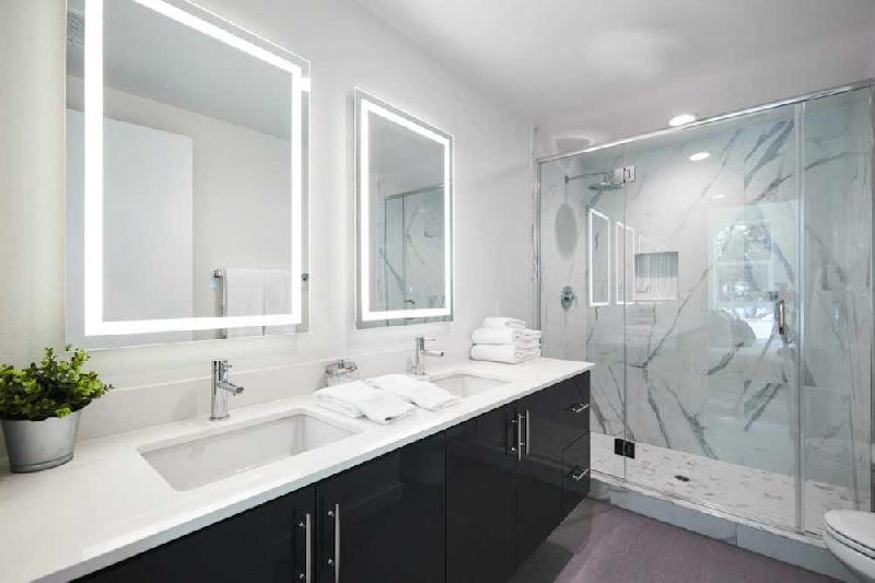 - Secondary baths with frameless Polylac high gloss cabinetry with stainless steel edge banding, shower or tub/shower combination with full height 4” x 16” ceramic wall tile, Quartz countertops, vanity mirror with integrated LED lighting and Moen® plumbing fixtures