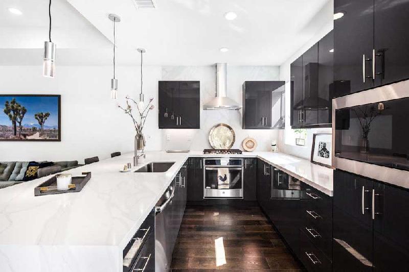 - Frameless Polylac high gloss cabinetry with stainless steel edge banding with adjustable shelves, concealed hinges, soft closing drawers and doors and satin nickel cabinet pulls