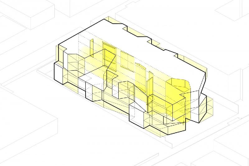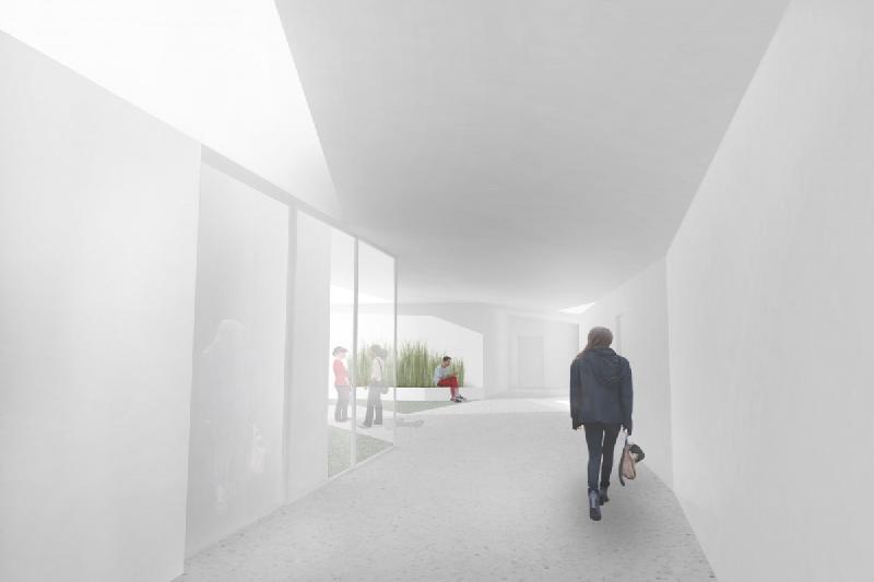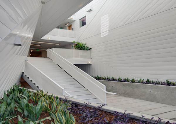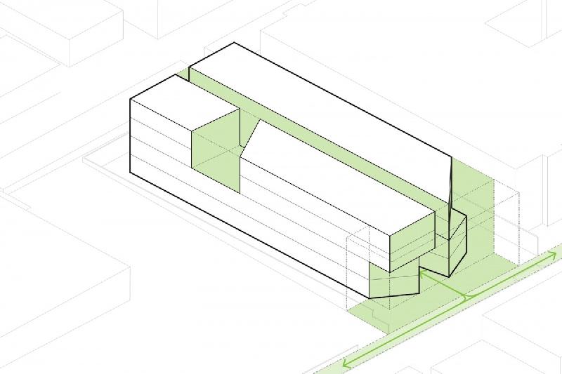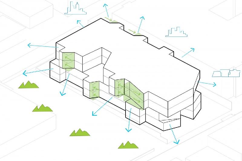 Exterior materials are a combination of fluted metal and flush panels comprised of recycled content material. These materials promote long-term life cycle with proper maintenance and, through the utilization of a folded form and differing degrees of transparency within the material, provide another means of reducing the project massing.