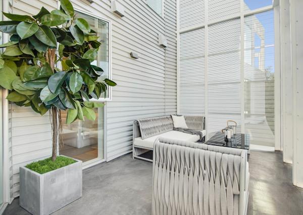 Creating a seamless transition between public life and the private sphere, the design of the street-facing elevation integrates a strategically voided space to provide a direct visual and physical connection from the sidewalk to the entry courtyard. This double-height space opens to a communal landscaped atrium and serves to reduce the projects mass at the street frontage and contributing porosity and visual interest to the project. This entryway,and the circulation spaces beyond, is programmed with seating areas, various plantings and integrated bicycle storage, activating the space and further encouraging social interaction between visitors and residents.