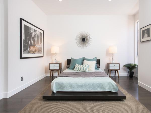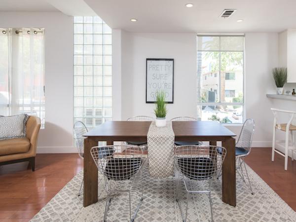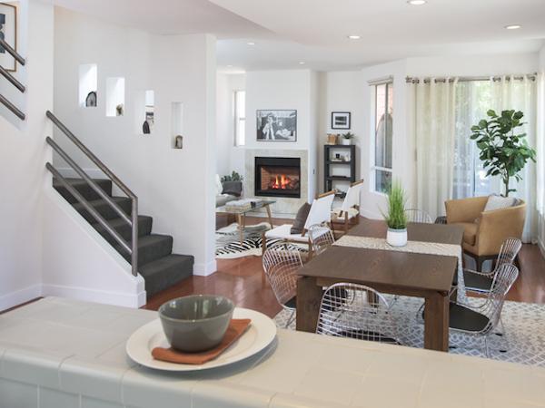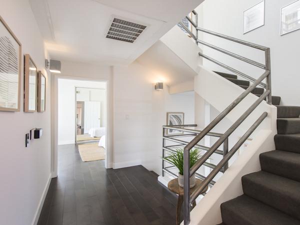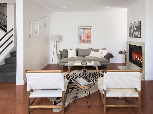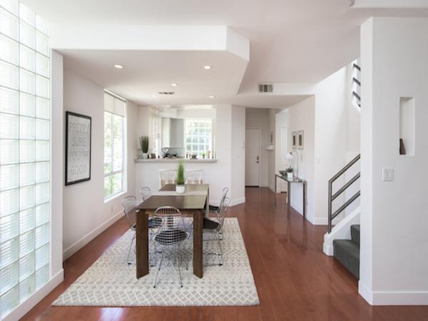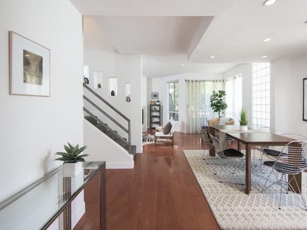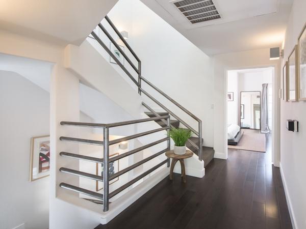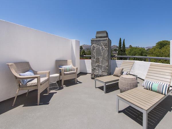 1133 North Formosa offers 5 townhome residences, each 3 levels and two bedrooms, ranging around 1,400 square feet. The feature a fireplace in the living room, laundry in the unit, and a large private rooftop deck with panoramic views. The ground level houses the living room, dining area, kitchen and a half bath. The second level contains a roomy master suite with vaulted ceilings, walk-in closet and full bath, as well as a second bedroom with private bath. A second staircase leads to a private roof deck with views of the Hollywood Hills or the city. Most of the units have been upgraded with hardwood floors, stone counters, custom cabinetry and spa like baths.