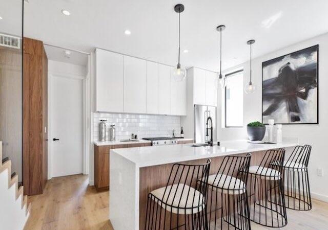 The homes are designed to maximize natural light and open space, featuring expansive walls of glass and a warm, sophisticated palette of earth-toned finishes. Interiors exude timeless elegance, blending modern convenience with superior craftsmanship. The thoughtfully curated details include custom-built cabinetry, integrated desks, and designer hardware, all complementing the wide-plank white oak hardwood floors.
