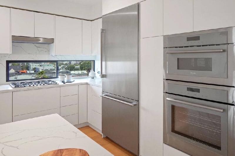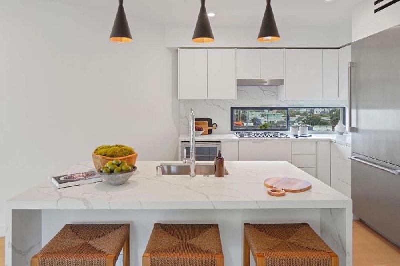 Other key accents of each unit include gorgeous European oak hardwood floors, Calcutta Laza Quartz countertops with waterfall islands, custom white cabinetry with built-in wine fridges, Thermador fridge, dishwasher, and gas stovetops as well as wifi-enabled ovens and microwaves.