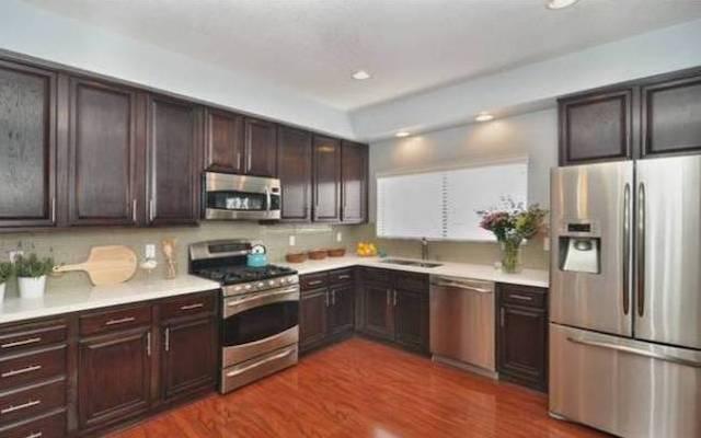 166 South Hayworth offers 12 units on 3 floors with two bedroom layouts ranging from 1,450 square feet up to almost 1,700 square feet. They feature open concept living spaces, a fireplace in the living room, formal dining room, kitchen with breakfast bar, in-unit laundry and private balconies. The primary suites include walk-in closets and en-suite bath with dual vanities, soaking tub and separate shower. Many of the units have been upgraded with hardwood floors, granite countertops and stainless steel appliances.