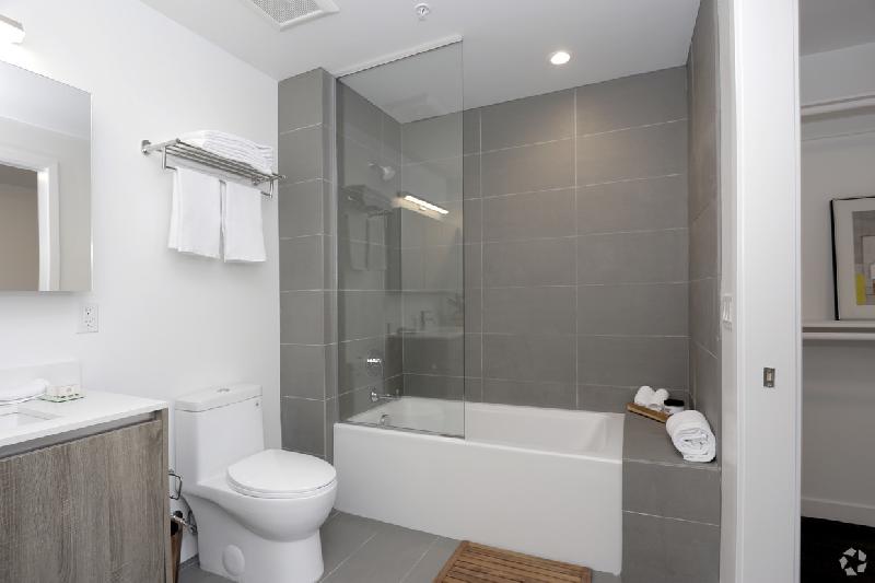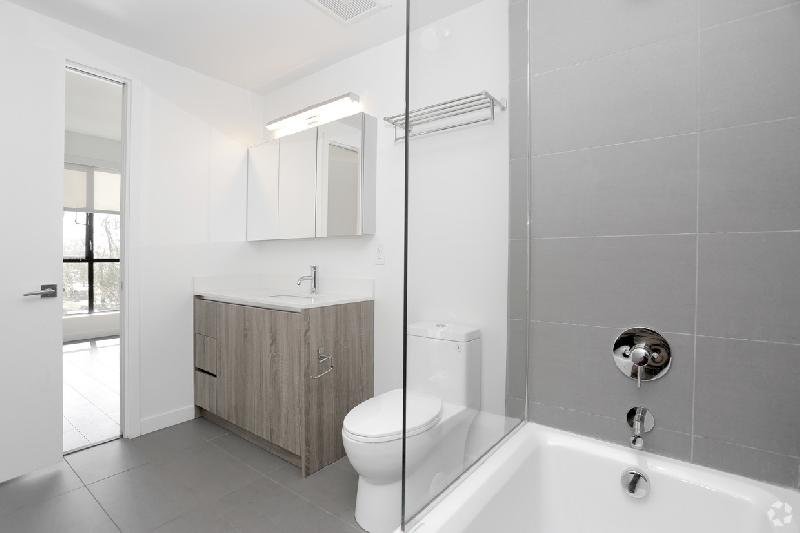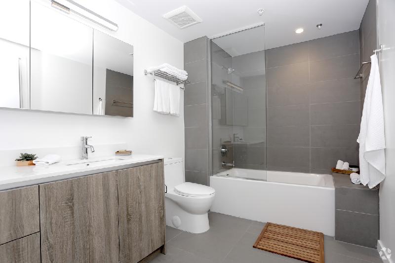 The bathrooms were designed using high quality materials including rich cabinetry, floor-to-ceiling porcelain tile, and modern hardware.