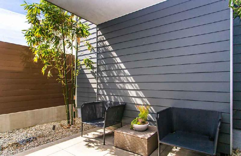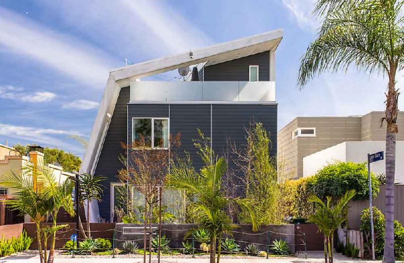 In keeping within the strict 30-foot height limit for this area of Venice, the pitched roof utilizes an angled ridge line, which reduces the mass of the project by creating a varied roof line that pitches along the long and short elevations. This strategy also provides each home with a unique roof form.