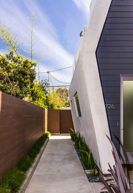 726 California consists of three homes utilizing the Los Angeles Small Lot Subdivision Ordinance on a tight 40-foot wide by 130-foot deep property near Abbot Kinney Boulevard in the Venice neighborhood of Los Angeles. The homes are separated by courtyards; a layout that follows the precedent of 1920’s Southern California bungalows. The courtyards create a clear identity for the three homes, break up the building massing and provide the residents with a private landscaped outdoor space. In the front home facing California Ave, this outdoor space acts as a modern porch engaging the street.