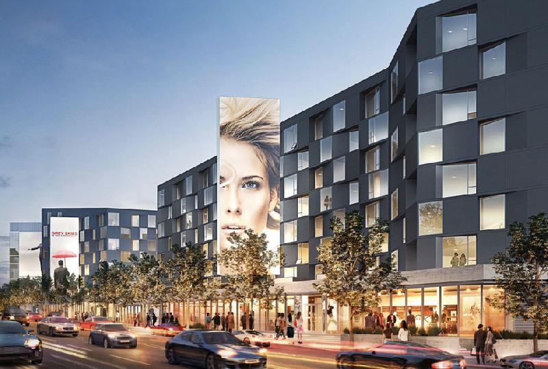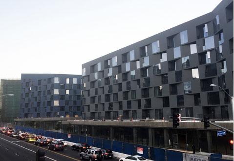 A corridor slices through Sunset Millennium’s tall buildings, returning ground space to the public and gesturing to the larger city by creating a framed vista. The transparency of the glass-enclosed ground level blurs the distinction between lower interior spaces and the exterior street; above, green roofs engage the outdoors, providing community park space and city views. A building envelope patterned with folds activates the project’s exterior by introducing a dappling of light and shadow. Large billboards interrupt this faceted surface, drawing on the culture of voyeurism historically embraced by the Sunset Strip.