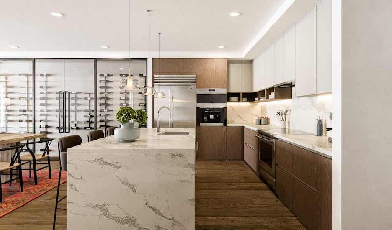 The interior details are one of the many highlights of living at The Alfred. Selected as much for quality as for style, the materials and finishes of each residence bring in a deep crescendo punctuated by refined natural elements. Marbelized countertops, elegant wood flooring and vessel bathroom sinks are just some of the touches of luxury.