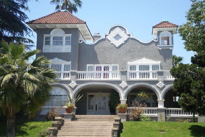 Powers House at 1345 Alvarado Terrace (HCM #86) was built in 1903 for Pomeroy Wells Powers and his wife Ida. Designed by Arthur L. Haley, the home is built in the Mission Revival style, and has been described as "exuberant" and the "flashiest on the block" for its fanciful stucco curlicue. The stucco house has an arcaded veranda that supports a second-floor balcony. Rising from the balcony are towers connected by a curved parapet wall. The large corner tower has a loft room accessible only from the home's exterior.