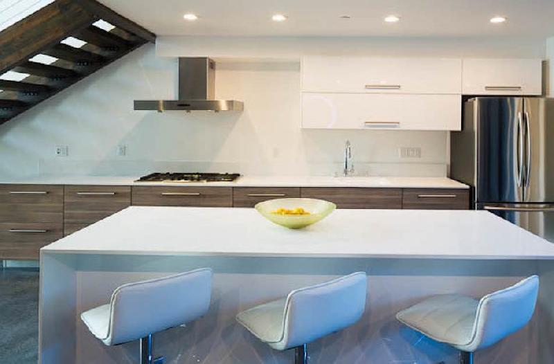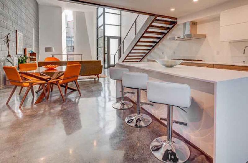 These four-level homes features skylights and polished concrete floors. The main floor includes the kitchen featuring Bosch appliances, quartz counters and a bar seating set up at the center island. Off the kitchen area, a set of sliding glass doors open onto private outdoor spaces. There are two bedrooms, a sleeping loft that could be used as a third bedroom, and three bathrooms. Both bedrooms and the sleeping loft have a balcony, accessible through sliding glass doors. There are also finished rooftop deck areas.