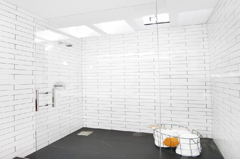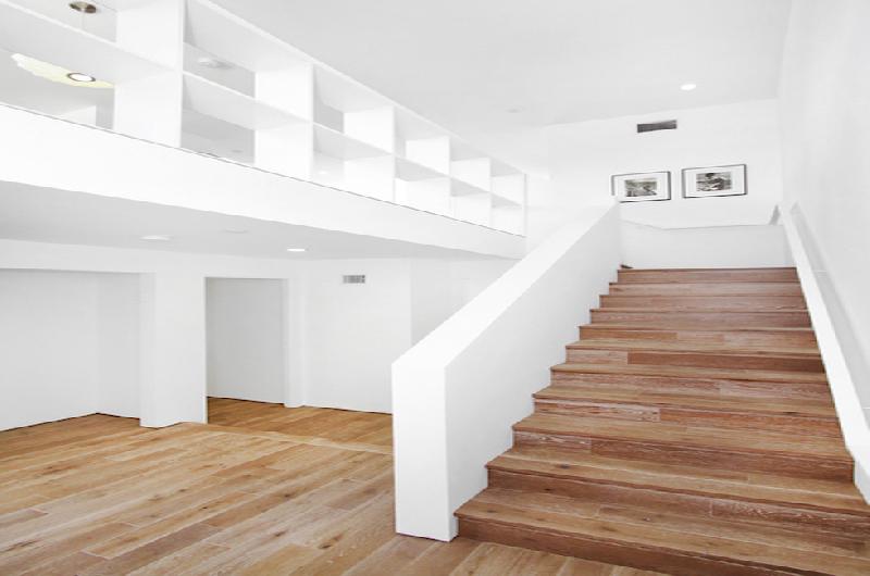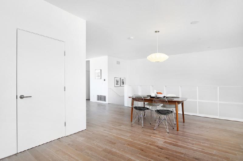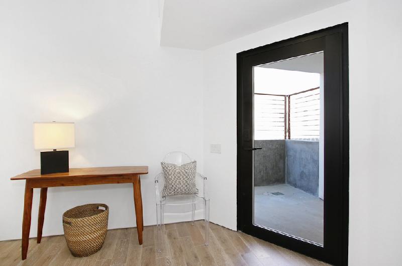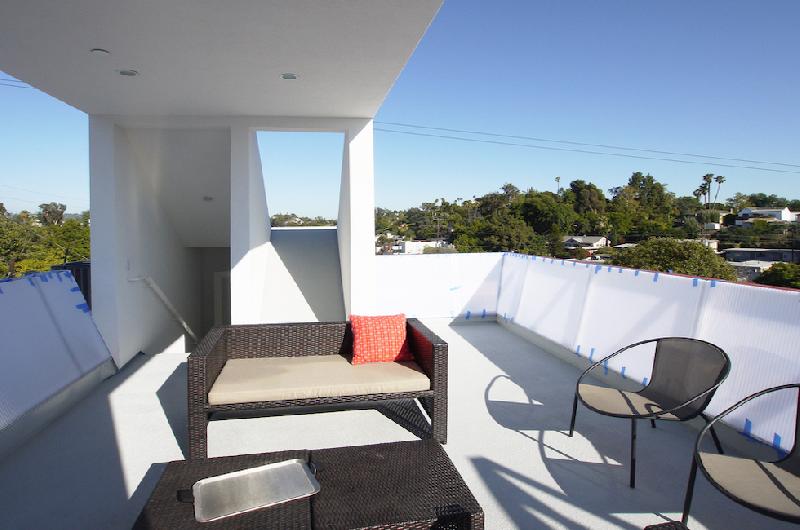 The homes are three stories with garages and entry on the first level, an open plan living area on the second floor including living, dining, and kitchen space. The third floor typically has three bedrooms with the master suite facing the hills of Silver Lake. Roof access is provided on lots 2-6. The exterior of the project has custom tile inlaid around the windows.