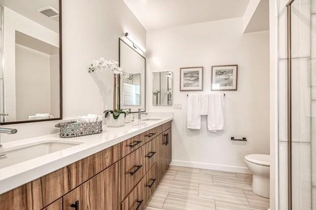 - Quartz countertops with square edge in all bathrooms
