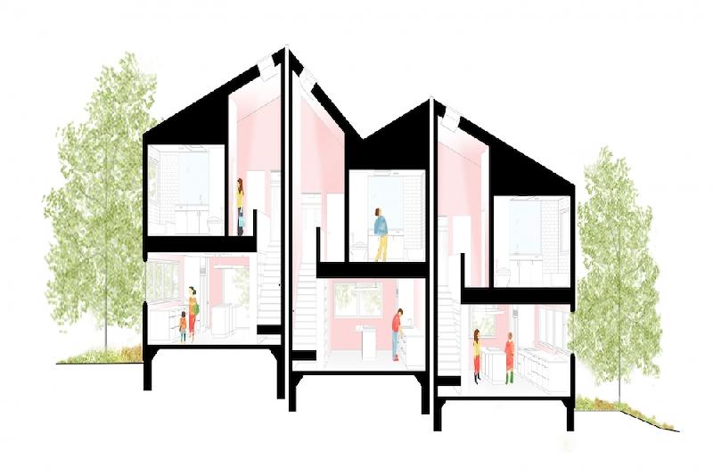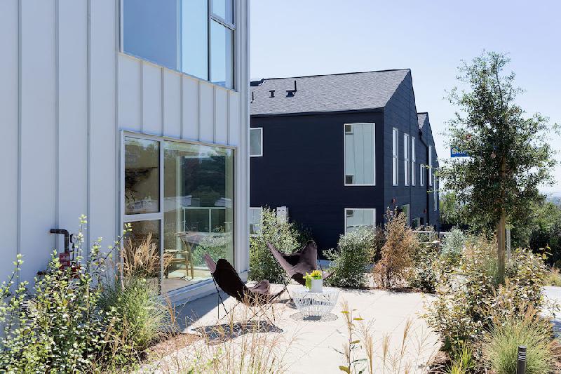 The placement of the houses in the hills mimics the early 20th century craftsman cabins of the area, and deploys a sleight of hand, combining several houses into a single house shaped volume. This conceals the actual density of units by maintaining the neighborhood shape and landscape context across the .82 acre site. The 18 houses are situated in a drought tolerant landscape with mature trees that is woven into the surrounding neighborhood fabric. The Blackbirds community is a thoughtful blend of private, semi-private and public space, and promotes connections with neighbors and the community. The emphasis of the design is on a higher quality of life within an urban context by promoting interactions between neighbors, links between units with native landscaping, and medium density with sensitive scale and massing.