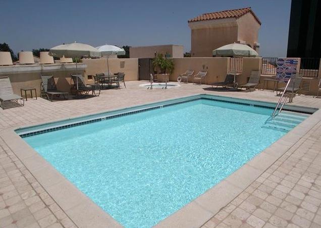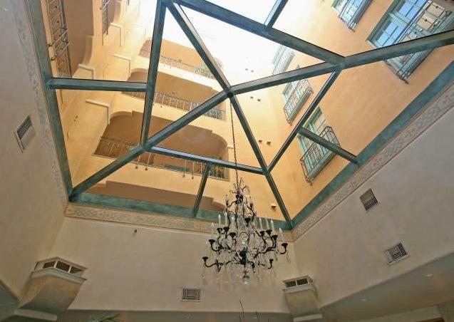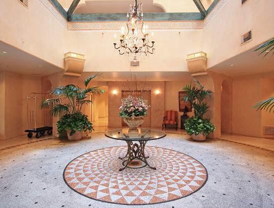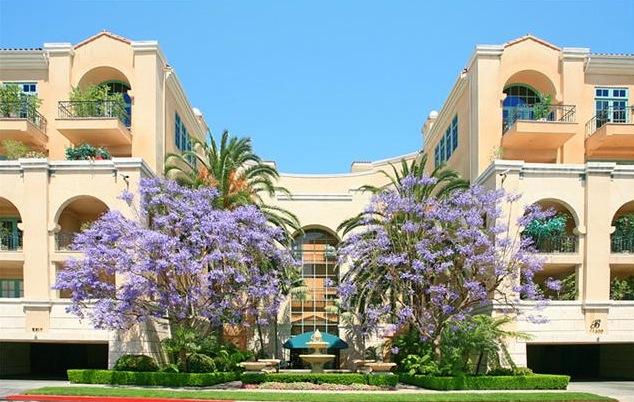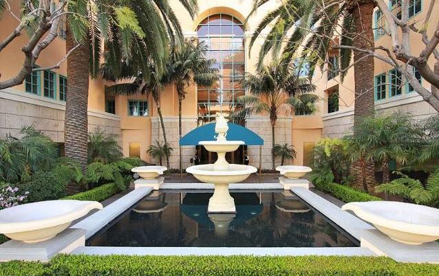 The building offers lush grounds and beautiful fountains with amenities that include a concierge, banquet facilities, a pool, spa, gym and valet.