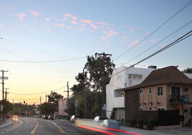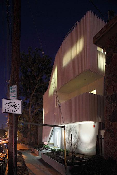 Buzz Court offers 6 residences available in 3 bedroom layouts ranging from 1,500 square feet up to 1,900 square feet. The three story homes have three unique floor plans with rooftop decks with views of the Griffith Observatory. Rather than build a row of homes serviced by a single loaded driveway, Buzz has a unique snaking driving that weaves between the homes and adds over 40% of additional exterior surface area for day-lighting and ventilation. The exterior of the project is clad in vertical fins to provide privacy to the homes, aid the project in exceeding California energy standards by 30%, and create an engaging streetscape that transforms drastically from day to night.