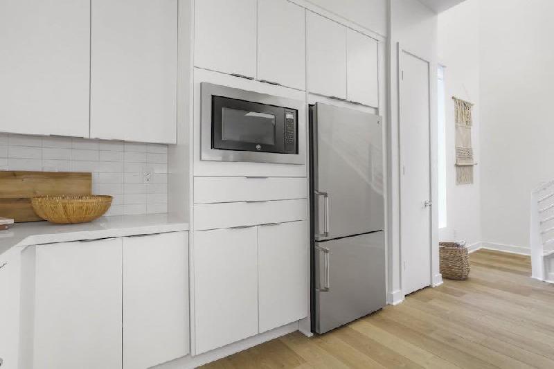 - Flat panel cabinetry in two color options: white or gray Thermofoil