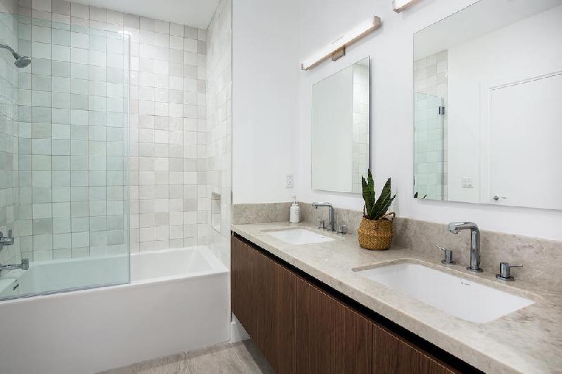 Kitchens and baths feature quartz countertops, designer cabinetry, Kohler fixtures, and Wolf and Sub-Zero appliances. Hand glazed porcelain tiles and high-quality fixtures are hallmarks of these new homes. A sparkling swimming pool, community gathering space, fitness center and an abundance of landscaped courtyards offer endless opportunities to enjoy.