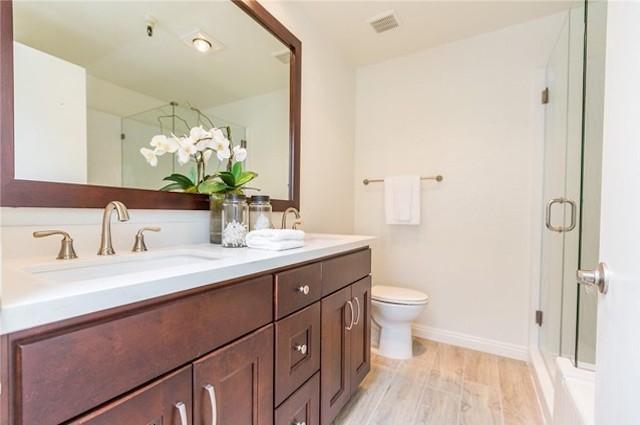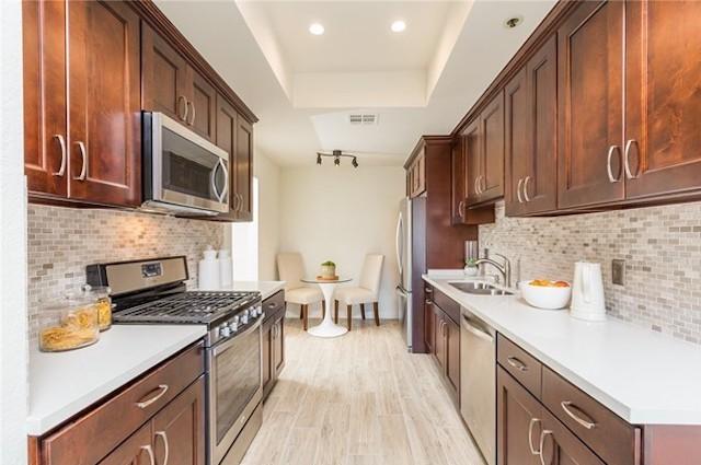 Dickens Contemporary offers 31 units on 3 floors with one and two bedroom layouts ranging from 1,000 square feet up to 1,700 square feet. They feature high ceilings, large living areas with fireplace and wet bar, private patios, in-unit laundry and gourmet kitchens with breakfast area. The master bedrooms offer walk-in closets and en-suite master bath with dual sinks, large tub and separate shower. Many of the units have been updated with hardwood floors, recessed lighting, crown molding, granite countertops and stainless steel appliances.