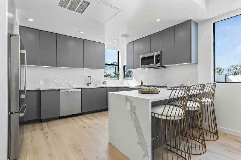 - Calacatta Quartz Islands with dramatic waterfall edge