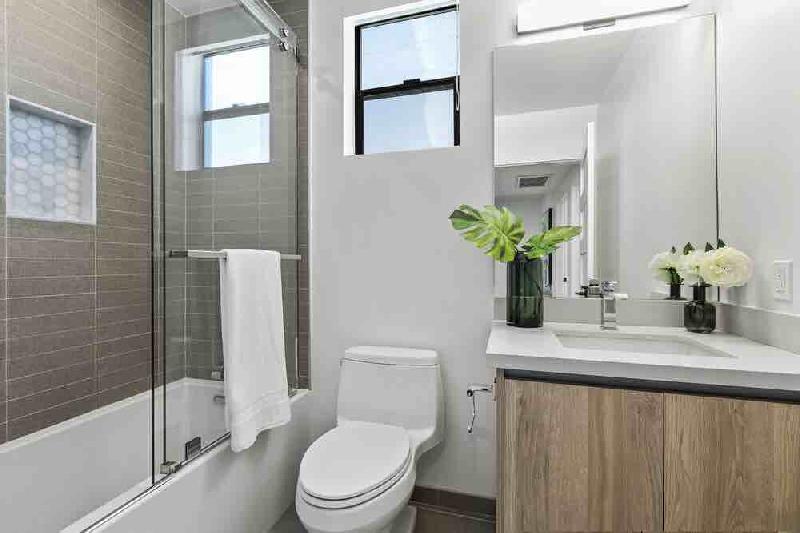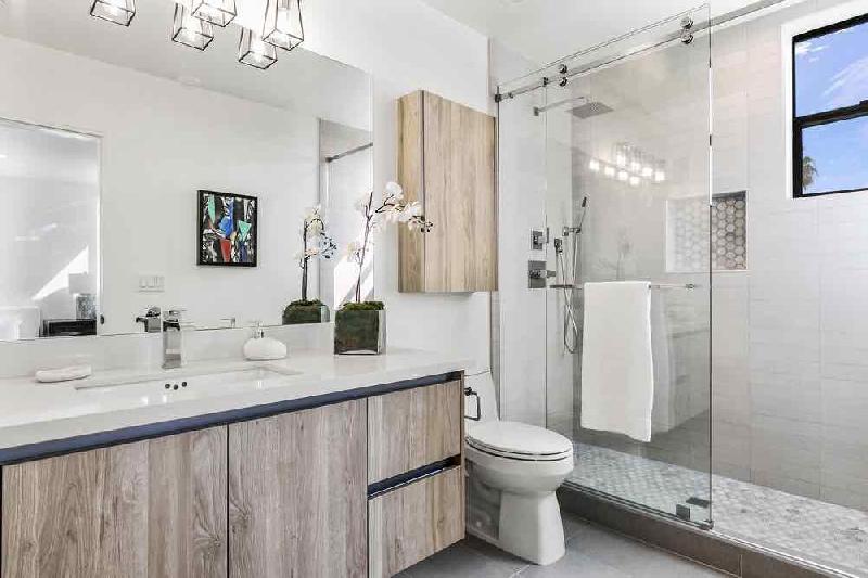 - Large stall shower with 3/8” frameless glass enclosure with chrome hardware