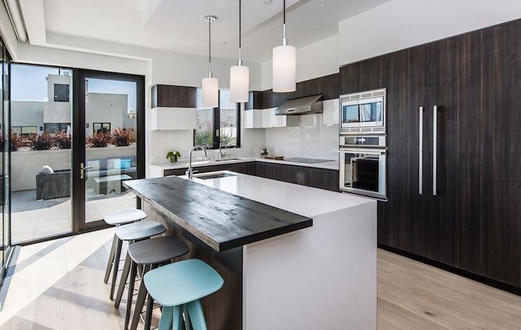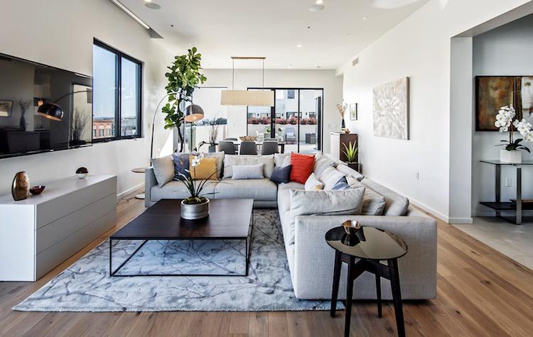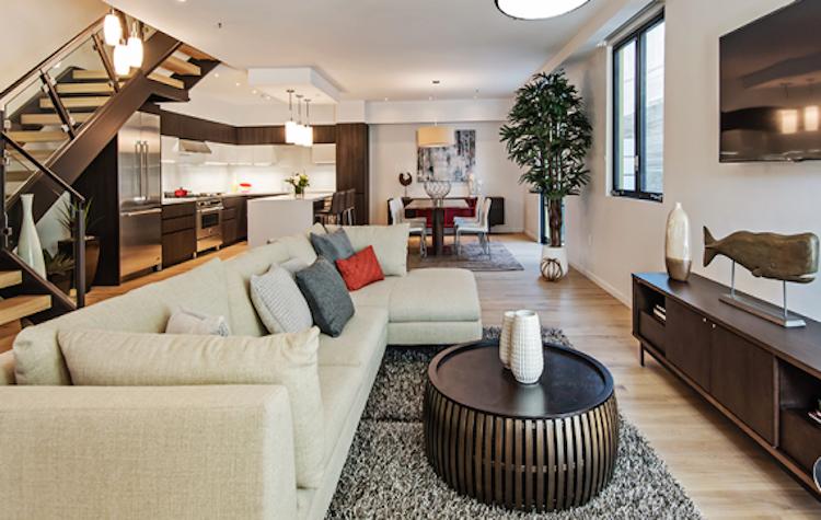 Townhomes are two-stories of beautiful, minimalist contemporary architecture, perfect for discerning new families. Each features a floating staircase built from rich oak, steel and glass, lit by two-story light wells. Pendant lighting hangs in the open spaces, adding a warm glow throughout the open flowing floor plans. Residents can take in the beautiful California weather on the ample 200 square foot terrace.