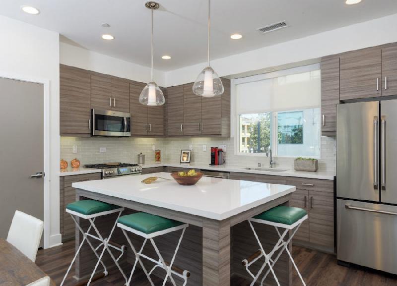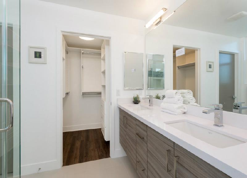 Caesarstone Counter Tops, Large Center Island with Waterfall Counter + Seating Area, Full Height Backsplash in Designer-Selected Glass, Stainless Steel Under-mounted Sink in Kitchen, High End Cabinetry, Contemporary Stainless Steel Appliances in Kitchen, Under Cabinet Lighting in Kitchen, Frameless Glass Shower Enclosure, Bathtub in 2nd Bedroom, Dual Sink Vanity in Master Bathroom.