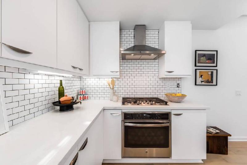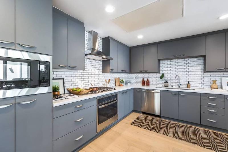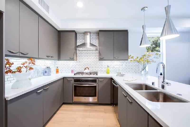 - Quartz slab countertops with 2” x 4” ceramic tile backsplash and stainless steel undermount double compartment sink with Moen® brushed nickel pullout faucet