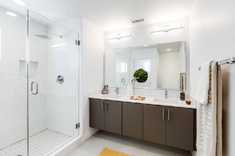 - Master bathroom with designer-selected 12” x 24” porcelain tile floor, frameless laminate cabinetry, vanity mirror, slab countertops and dual undermount rectangular sinks with Moen® plumbing fixtures