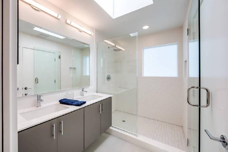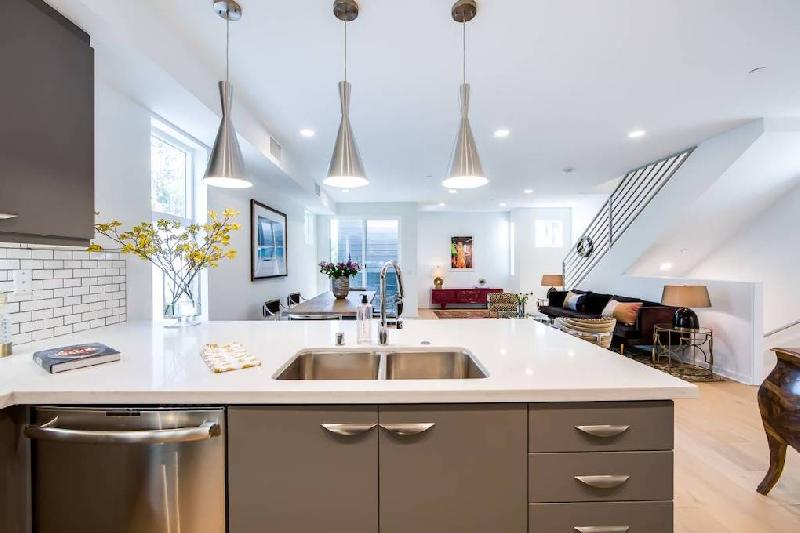 - Designer-selected light fixtures over kitchen island and in bathrooms