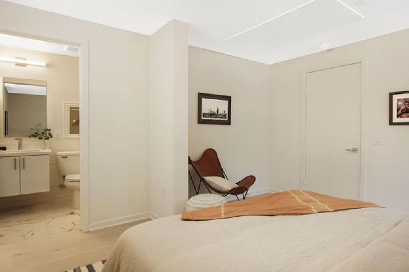 - Contemporary cabinets with stainless steel hardware