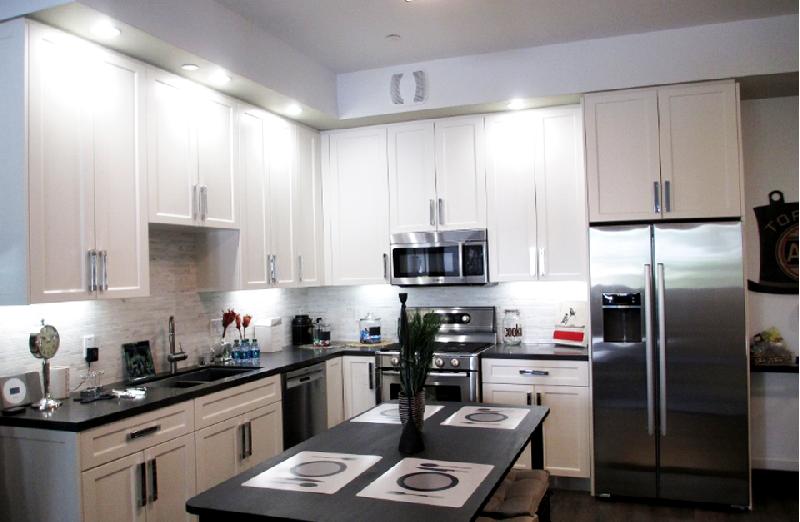 - Caesarstone countertops and marble backsplashes