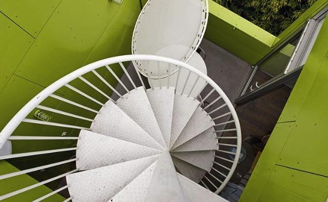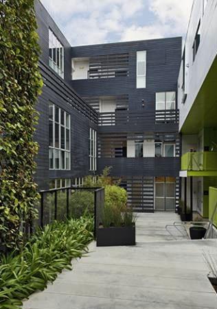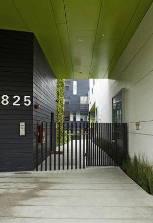 Internally, a loose central courtyard is bound by weaved circulation. Walkways open and constrict, encouraging impromptu interactions. Habitat 825’s 19 units all open to this common space and landscaping, rather than “hard” boundaries, delineates private area set within the common courtyard. The pushed-back front façade promotes a semi-public zone that offers benches between the building and the street. The building cultivates an agenda for urban community both within and beyond its walls.