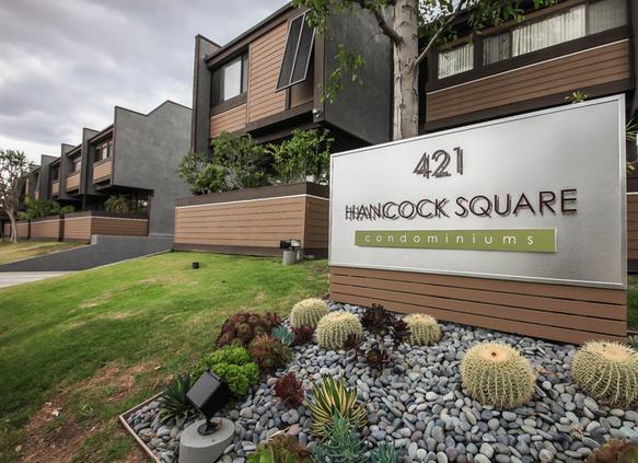 Hancock Square offers 51 townhomes on 3 floors with two and three bedroom plans ranging from 1,600 square feet up to over 1,900 square feet. They feature formal entry, large living rooms with dramatic fireplace and wet bar, formal dining room, atrium with skylight, in-unit laundry and private patios. The gourmet kitchens offer a breakfast area and great cabinet space. The large master suites feature vaulted ceilings and an abundance of closets. The master baths include dual sinks, spa tub and separate shower.