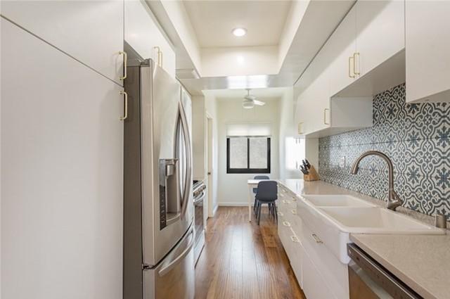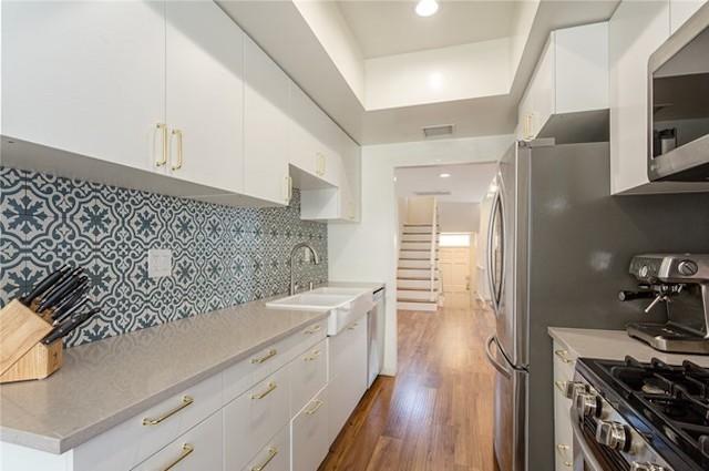 Hayvenhurst Townhomes offers 40 units, available in two and three bedroom layouts, ranging from 1,200 square feet up to 1,400 square feet. They feature formal living room with fireplace, formal dining room, galley style kitchens with breakfast area, private patios, in-unit laundry and private two car garages. The master suites have great closet space and private balconies. Many of the units have been upgraded with hardwood floors, recessed lighting, crown molding, granite countertops and stainless steel appliances.