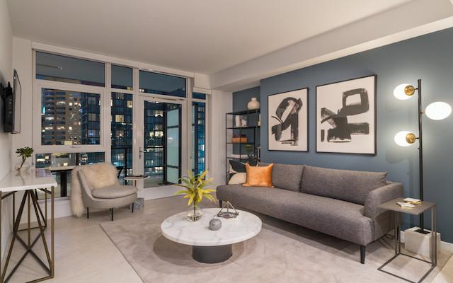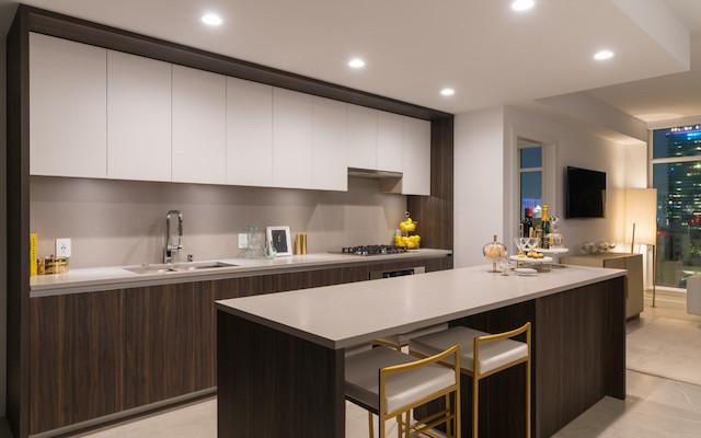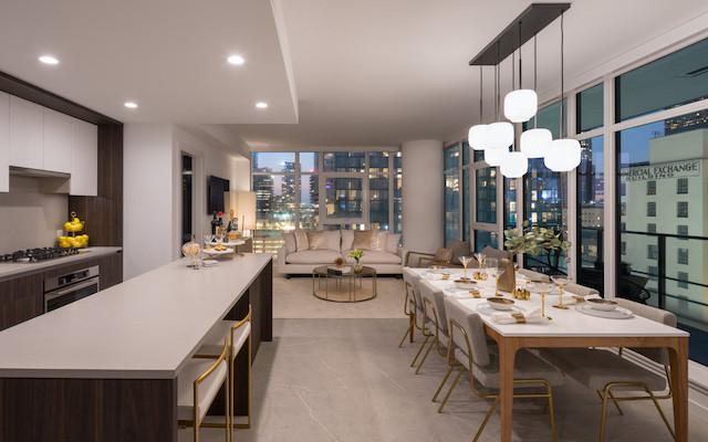 Thoughtful Finishes Enjoy floor-to-ceiling windows, spacious balconies, and seamless open-concept spaces in every home. Indulge in those deluxe little details, like a Nest thermostat, full-sized in-suite washer and dryer, and master bedrooms with custom walk-in closets, private ensuite bathrooms, and blackout blinds.