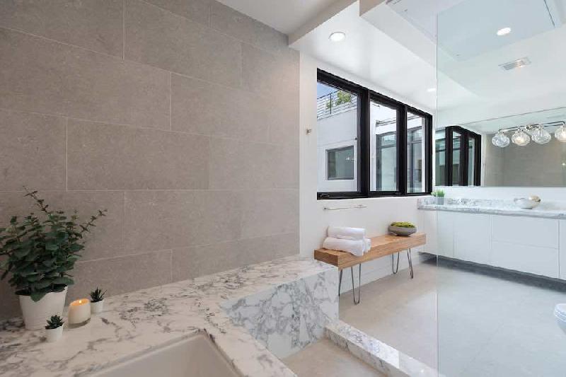 Platform tub with Italian porcelain limestone marble