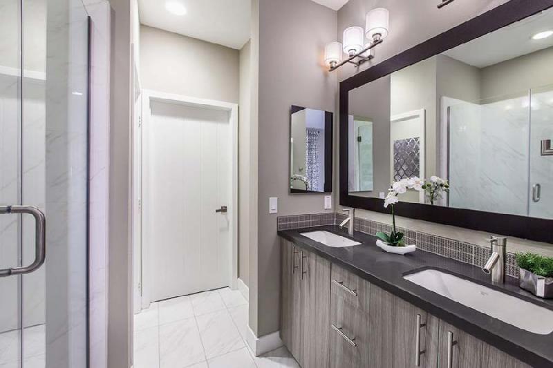 - Engineered Quartz Solid countertops for easy maintenance showcasing modern glass and ceramic accent tiles with undermount sinks at kitchen and bathrooms