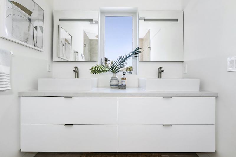 - Master bathroom with designer porcelain tile floor, custom vanity with integrated LED lighting, quartz countertops and dual sinks with designer plumbing fixtures