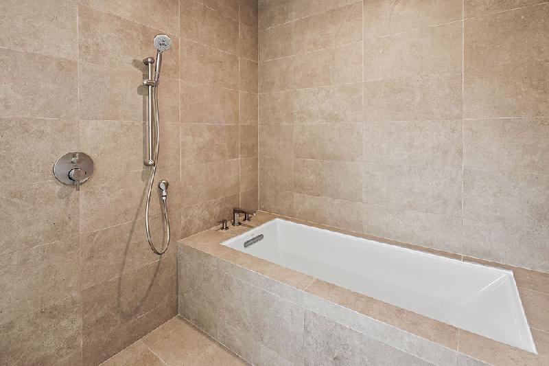 - Shower with frameless glass enclosure, designer wall tiles, ‘rain’ shower heads and porcelain tile floor