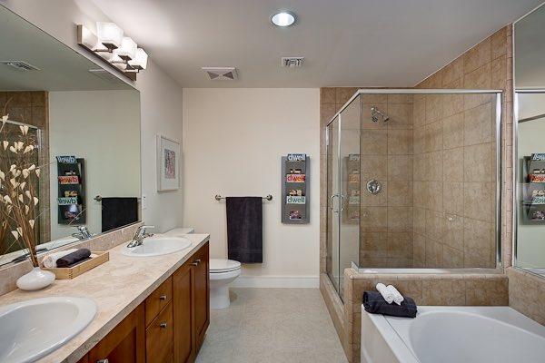 - Custom home quality bathrooms featuring beautiful tavertine counters, tile floors, stunning floor to ceiling tiled showers with dual massage showerheads, and oversized soaking tubs