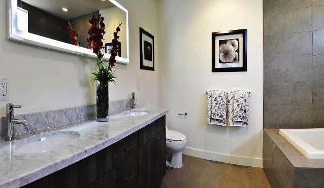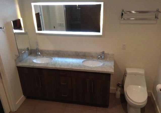 Polished Carrara marble in Master and Guest Baths with dual sinks in the Master Bath
