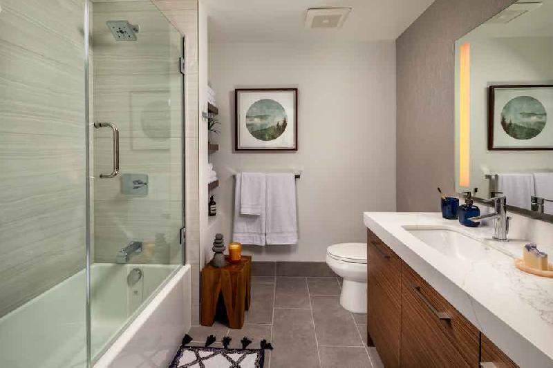 - Posh bathrooms with quartz countertops and porcelain tile