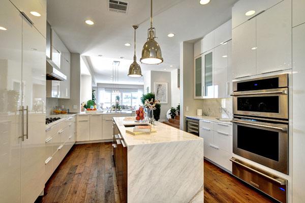 The open plan kitchens brings chef caliber features together with contemporary design to offer residents the ideal in functional elegance. A wrap around countertop with a breakfast bar and a large central prep island are both clad in white Italian marble with sleek waterfall edges. Custom white lacquer cabinetry and integrated appliances with white lacquer panels further enhance the kitchens sophisticated aesthetic. Premium appliances, including a Bertazzoni gas range, dual wall ovens, a warming drawer, two dishwashers, and a wine refrigerator enable residents to create and serve gourmet cuisine with ease and style.