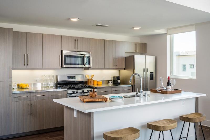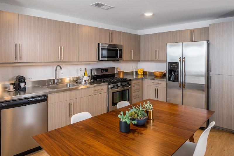 - Kitchens feature stainless steel appliances, Grohe fixtures, and granite, quartz, or stainless steel countertops