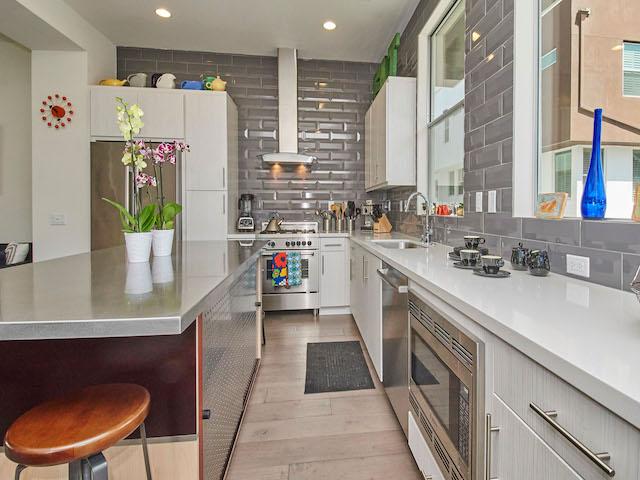 - Contemporary European cabinetry with brushed nickel pulls