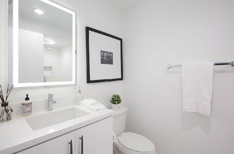 - Secondary baths with frameless textured laminate cabinetry with brushed satin nickel pulls, shower or tub combination with full height 4” x 24” ceramic wall tile, Quartz countertops, vanity mirror with integrated LED lighting and Moen® plumbing fixtures