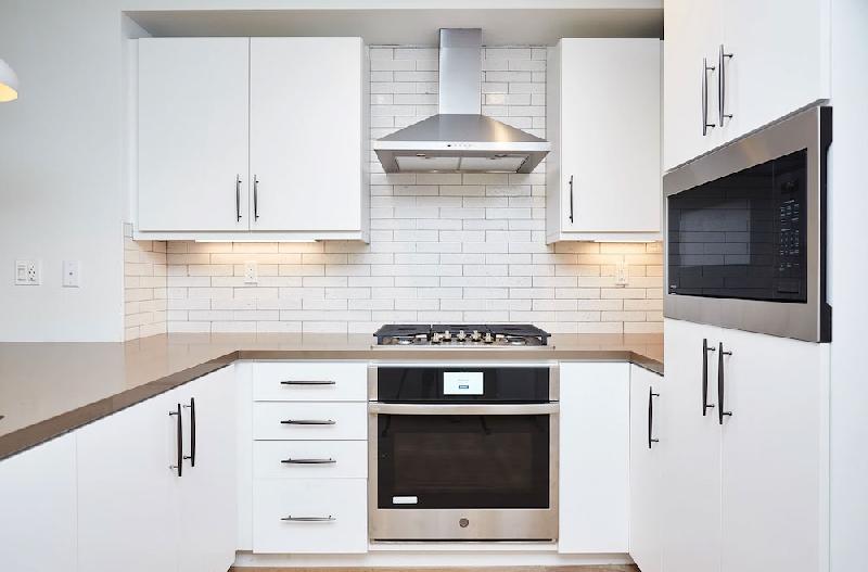 - Quartz slab breakfast bar and countertops, with glazed ceramic brick tile backsplash and stainless steel single compartment undermount sink with Moen® brushed nickel pullout faucet