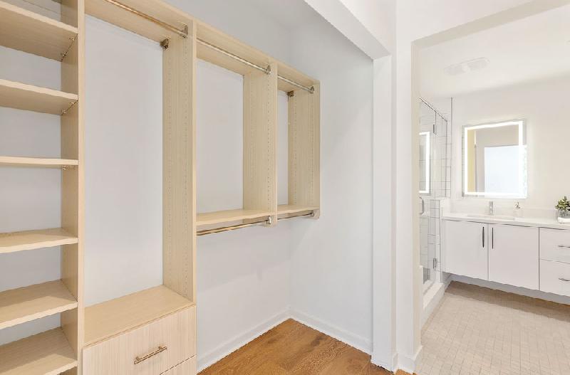 - Walk-in closet with single and double shelf and pole and mirrored door